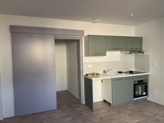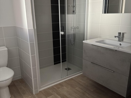- d'une cuisine équipée (hotte, four, plaques à induction) ouverte sur séjour/salle à manger, un cellier, une chambre, une salle d'eau, un WC, un local poubelle.