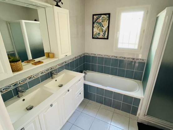 - d'un grand séjour ouvert sur une cuisine équipée, un couloir de distribution desservant 3 chambres, une salle de bains avec douche et baignoire, un WC séparé.